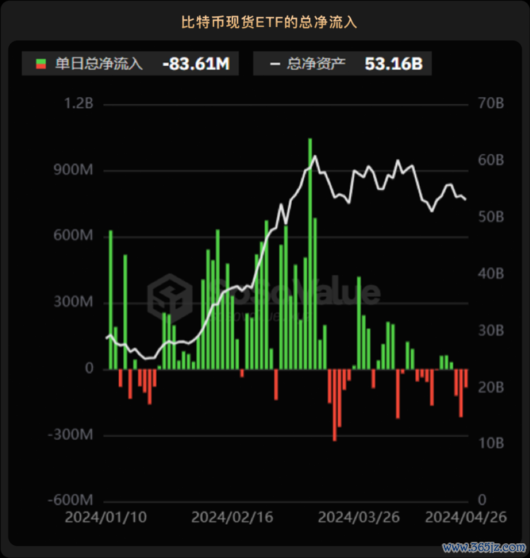 这种情况可能说明了一点——目前比特币的走势确实已经被美国ETF绑定。整个四月,ETF呈现出净流出的走势。