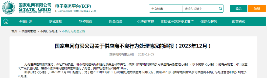 此前,为促进供应商诚实守信、保证质量,确保电网建设顺利进行及安全可靠供电,国家电网对《国家电网有限公司供应商关系管理办法》进行了修订,并自2023年11月10日起施行。