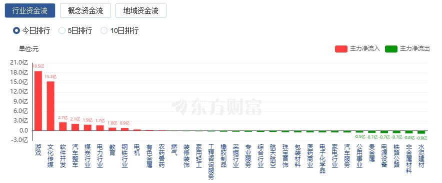 行业资金流向:18.48亿净流入游戏