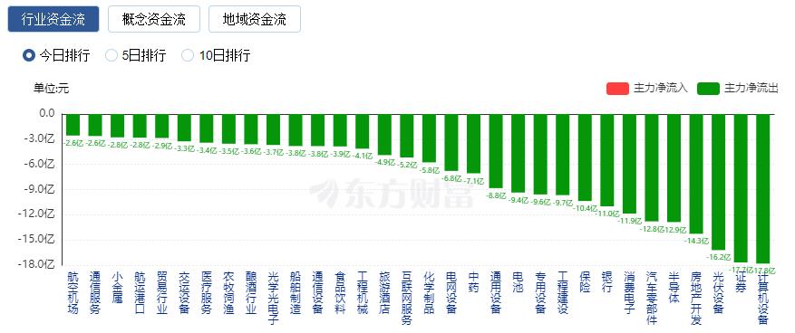 净流出方面,计算机设备、证券、光伏设备等净流出排名靠前,其中计算机设备净流出17.82亿元。