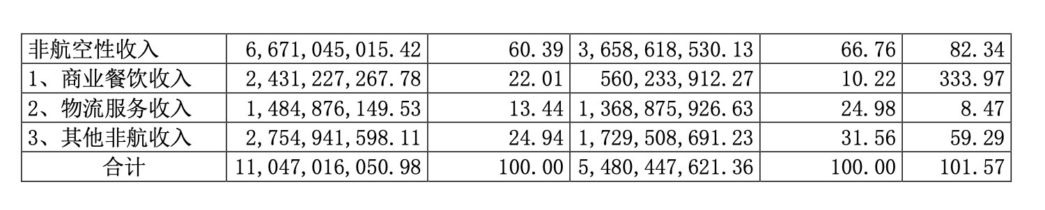 其中,商业餐饮收入同比增长主要是受航空业务量同比大幅增长影响,商业经营权转让及租赁收入同比增加所致;物流服务收入同比增加主要是两场货邮吞吐量同比增长所致;其他非航收入同比增加主要是受航空业务量同比大幅增长影响,航空配套延伸服务以及房屋场地租赁等收入同比增加所致。